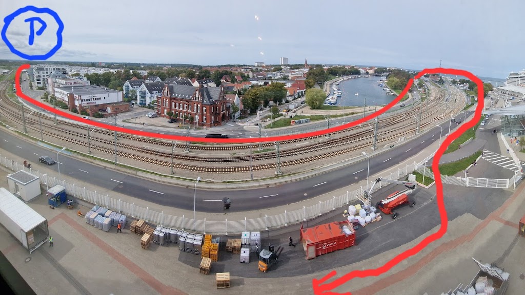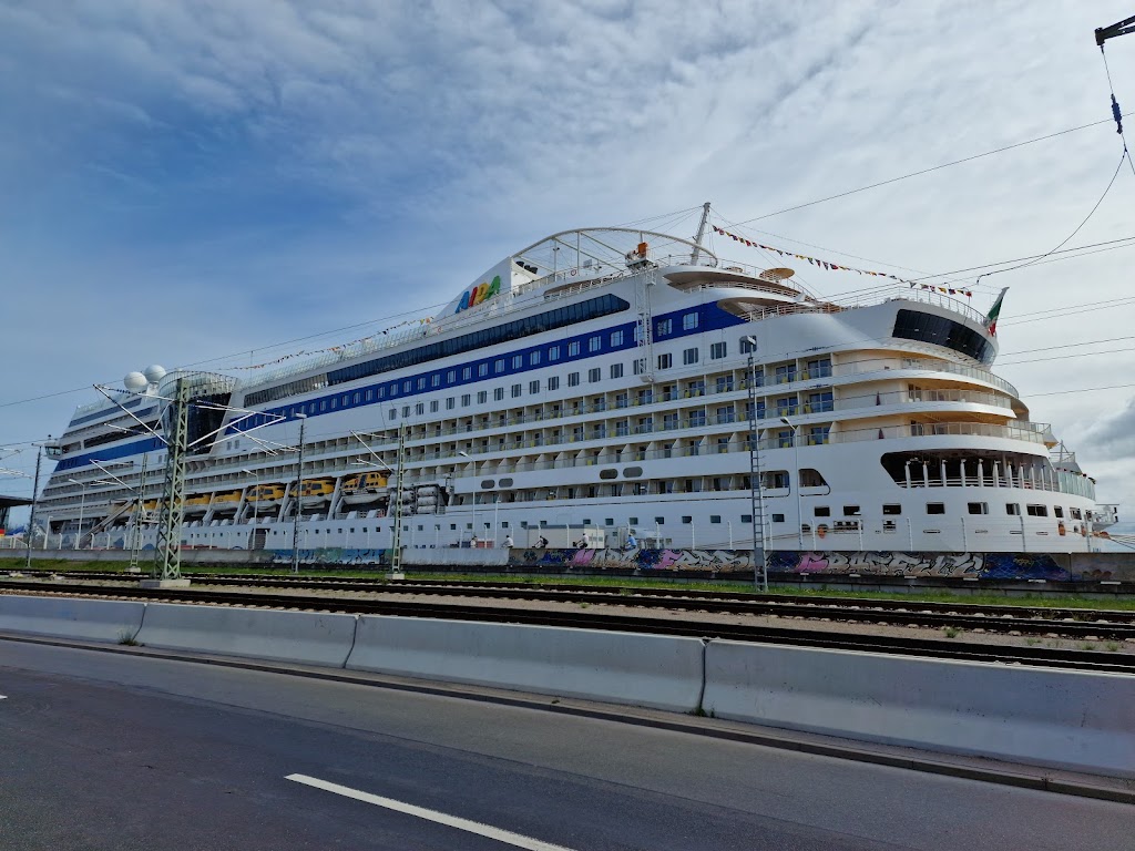Vier Uhr in der Nacht und wir hören die Nachrichten im Radio. Verrückt geworden? Nee, um 5 geht’s los, Richtung Warnemünde. Es geht zügig voran, bis um 7 Uhr die Augen schwer werden. Also raus auf den Rastplatz, um einen Kaffee zu besorgen. Alles noch zu hier und wir müssen an den Automaten. Der will nicht so wie wir. Nachdem wir ihn dann doch überredet haben, uns einen Kaffee zu geben, bin ich auch wieder wach und es kann weiter gehen. Um 11:30 Uhr biegen wir ins Parkhaus ab. Als wir die Koffer am Eingang abgegeben, kommt die Frage, ob wir gefahren werden möchten. Die wir natürlich mit nein beantworten, das Schiff ist ja in Sichtweite.