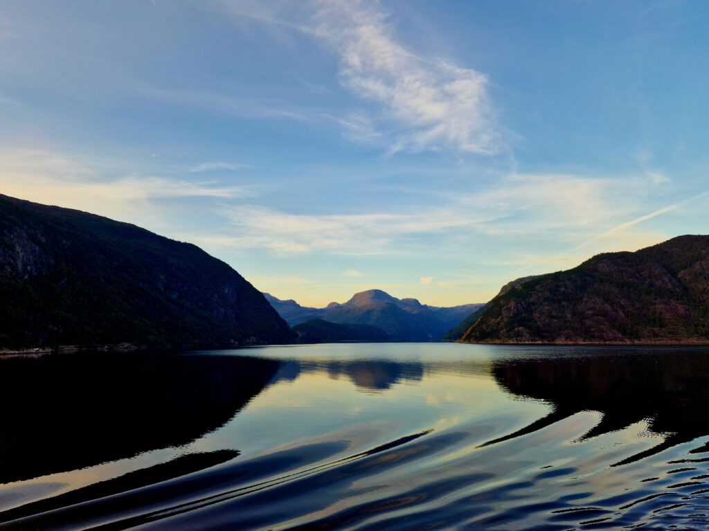 Nach dem Seetag wartet unser nächstes Ziel, Eidfjord. Vom Seetag gibt es nicht viel zu berichten, halt an Backbord, Steuerbord, Bug und Heck überall Wasser. Irgendwie schon gewöhnungsbedürftig, den ganzen Tag nicht von Bord zu können. Also trinken und essen angesagt. Am Abend sehen wir Land an Steuerbord. Die Nacht fahren wir durch den Hardangerfjord. Also früh aufstehen, um die Landschaft und die Berge zu genießen. Zum Sonnenaufgang fahren wir standesgemäß durch die Hardanger Hängebrücke.