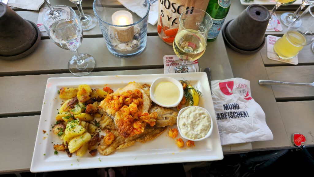 Aber heute genießen wir erstmal den Tag mit nichts tun, außer zwischendurch mal Kaffee holen. Die Zeit vergeht wie im Flug und dann auf zum Abendessen. Als wir losgehen, kommt dann das Wasser. Verkehrte Welt hier. Wo geht man an der Nordsee essen, natürlich beim Gosch. Alles passt, super Platz, lecker Wein und tolle Fischplatte. Die Sonne hat uns geschafft und der Wein wirkt.