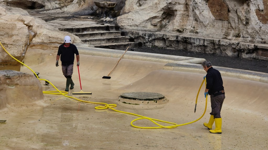 Wir überqueren den Platz und ein paar Gassen weiter kommen wir zum Campo de’ Fiori, einer der Märkte in Rom. Wir schlendern an den Ständen vorbei, aber an jedem Stand werden wir angesprochen und aufgefordert zu kaufen, schon ein wenig nervig. Dann halt weiter zum Trevi Brunnen. Als wir ankommen, ist kein Wasser im Brunnen. Er wird gerade unter Aufsicht der Polizei gereinigt und das Geld wird eingesammelt, welches traditionell über die linke Schulter in den Brunnen geworfen wird.