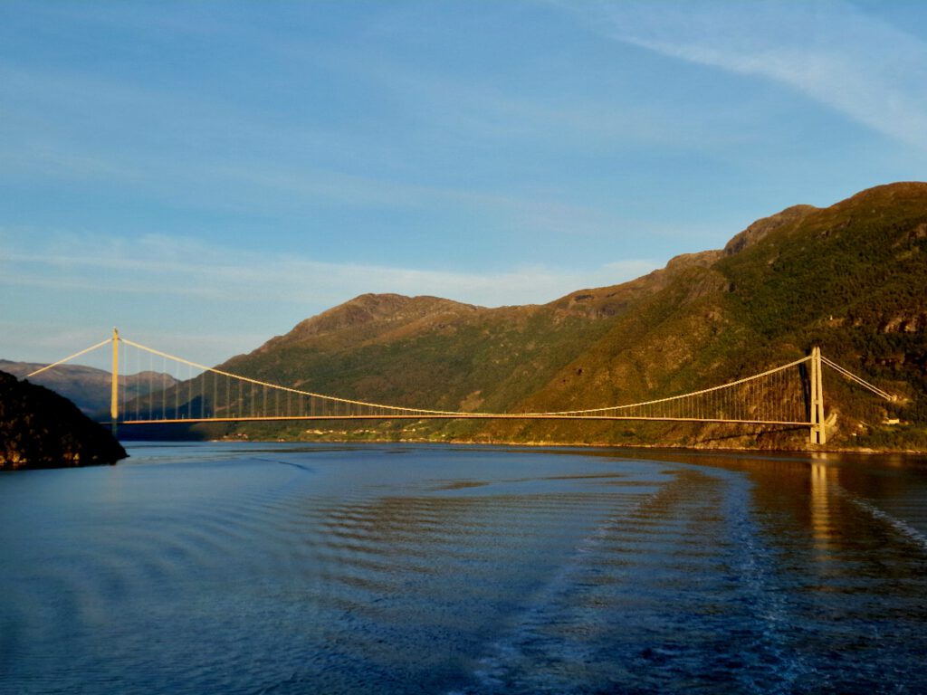 Zurück an Bord genießen wir die Ausfahrt von unserer Kabine und zum Sonnenuntergang sind wir schon wieder unter der Hardanger Brücke. Für einen Tag, schon fast zu viele Eindrücke.