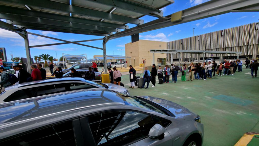 Der Flug verläuft ohne Probleme. Beim Landeanflug werden wir ein wenig durchgerüttelt. Ich glaube das Gefühl dieses Mal war es besonders heftig, habe ich jedesmal. Dann raus aus dem Flieger und noch eine Ehrenrunde mit dem Bus übers Rollfeld. Die Koffer kommen auch zügig. Für den Weg nach Las Palmas haben wir uns den Linienbus ausgesucht. Also machen wir uns auf den Weg zum Busbahnhof. Aus der Ferne sehen wir schon, dass dies keine gute Idee war.